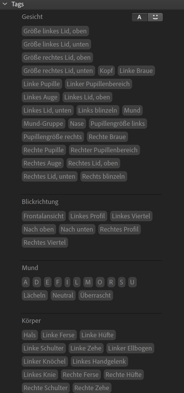Das Layout des Bereichs „Tags“ im Eigenschaftenfenster bietet einfacheren Zugriff auf Augentags, nach Auftreten sortierte Mundtags und entsprechende Symbole für mit Werkzeugen erstellte Tags (fest beim Punkt-Werkzeug, ziehbar beim Dragger-Werkzeug und baumelnd beim Dangle-Werkzeug). Das Kiefer-Tag befindet sich in der Kategorie „Gesicht“ der Tags.