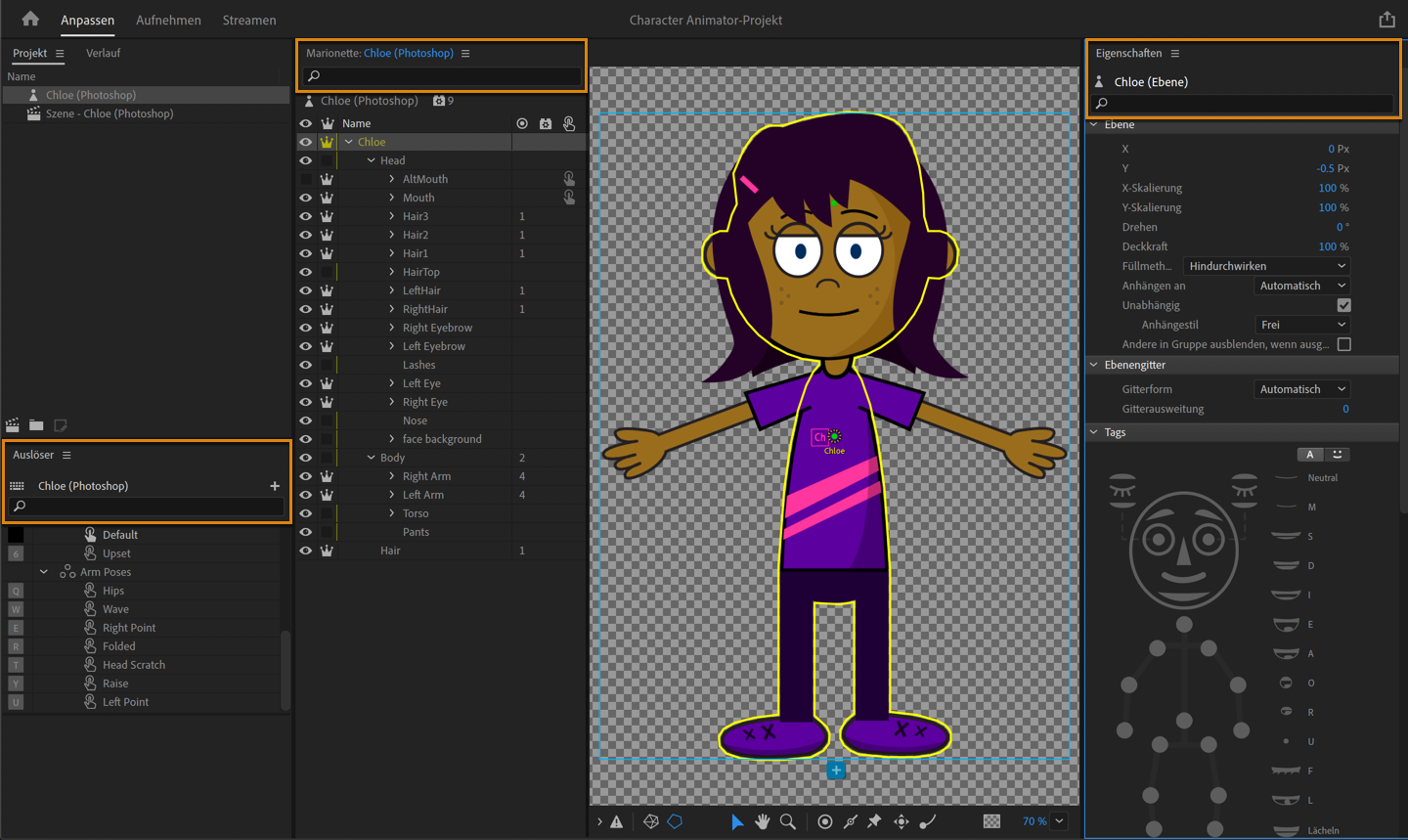 - Wählen Sie die Marionette im Projektfenster aus oder öffnen Sie sie im Marionettenfenster.