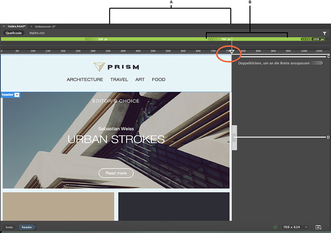 Wenn Sie die Seite in einer bestimmten Größe anzeigen möchten (Haltepunkt), klicken Sie auf die entsprechende Medienabfrageleiste. Das Dokument rastet am Haltepunkt ein.