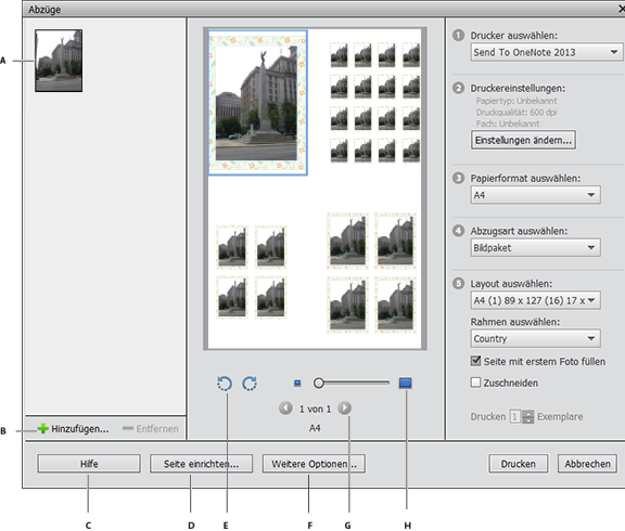 A. Ausgewähltes Foto B. Option, um weitere Fotos für den Druck auszuwählen C. Hilfe für die Verwendung der Optionen im Dialogfeld D. Konfigurieren der Seitenoptionen für den Druck E. Option, um das Bild zu drehen F. Optionen für das Farbmanagement G. Optionen, um durch mehrere Fotos zu navigieren H. Schieberegler für Zoom