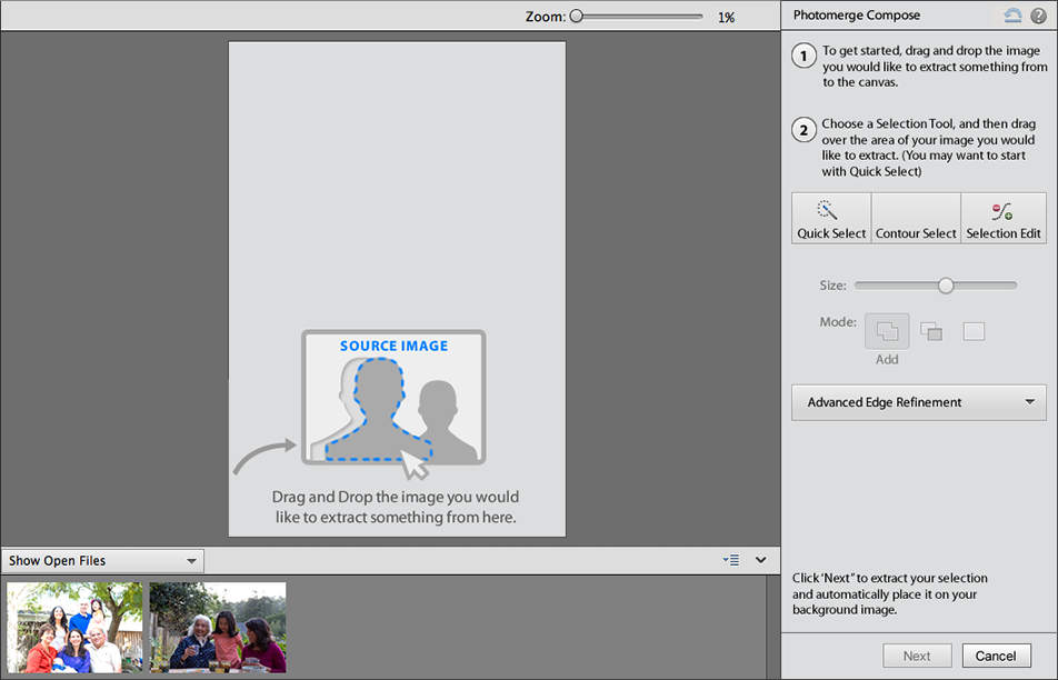 Mit der Funktion „Photomerge Compose“ können Sie Teile eines Bildes ersetzen. Beispielsweise können Sie den Hintergrund eines Bildes ändern. Sie benötigen zwei Bilder – eine Quelle und das Ziel. Sie können einen Bereich zum Freistellen aus dem Quellbild auswählen und diesen dann in das Zielbild einfügen.
