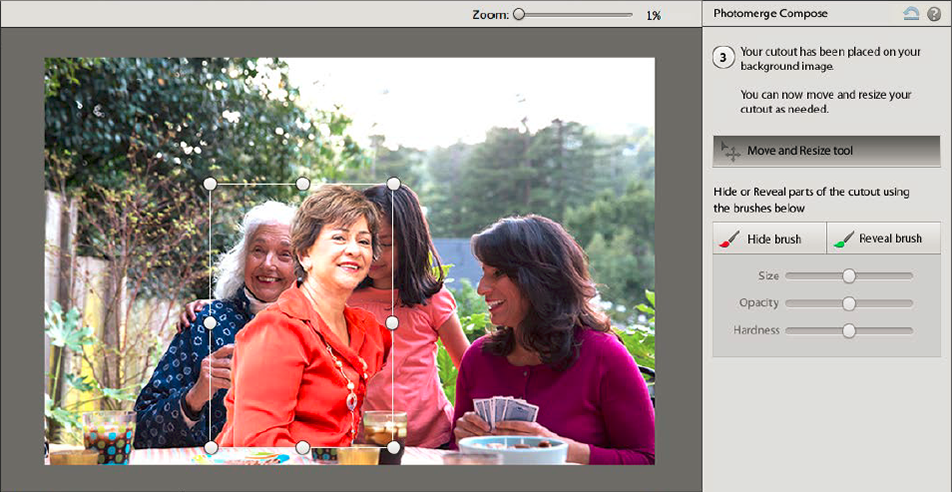 Fügen Sie die Auswahl in das Zielbild ein. Sie können die Auswahl verschieben oder skalieren. Mit den verfügbaren Pinseln können Sie auch Teile der Auswahl aus-/einblenden.