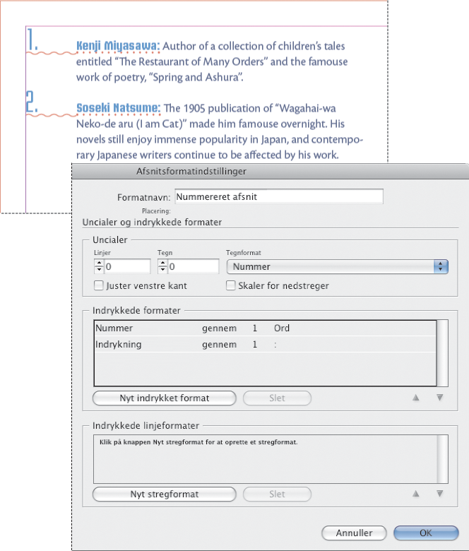 Bemærk:Du opnår det bedste resultat ved at anvende indrykkede formater som en del af afsnitsformater. Hvis du anvender indrykkede formater som lokale tilsidesættelser i et afsnit, kan efterfølgende redigeringer eller formateringsændringer i det indrykkede format forårsage uventet tegnformatering i teksten med det tilknyttede format.