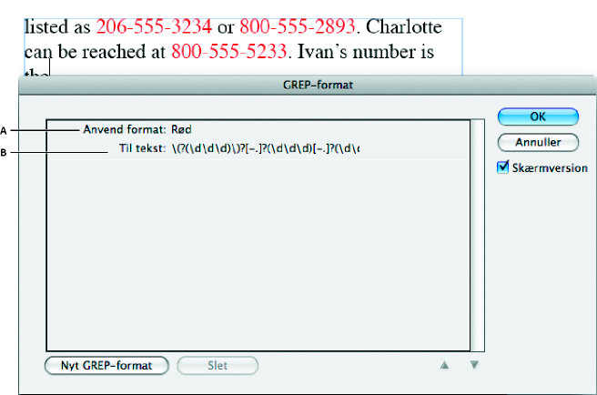 GREP er en avanceret, mønsterbaseret søgeteknik. Du kan bruge GREP-formater til at anvende et tegnformat på tekst, der svarer til det GREP-udtryk, du angiver. Forudsæt, at du f.eks. vil anvende et tegnformat til alle telefonnumrene i teksten. Når du opretter et GREP-format, skal du vælge tegntypen og angive GREP-udtrykket. Alle tekstafsnit, der svarer til GREP-udtrykket, er formateret med tegntypen.