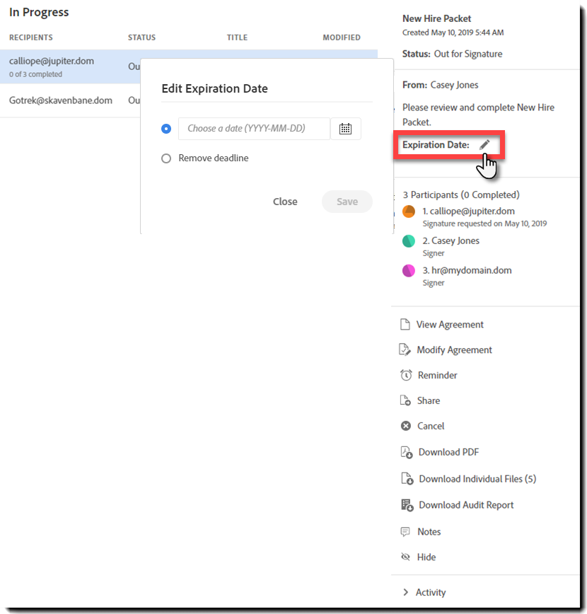 Vælg den aftale, du vil redigere, og klik på blyantikonet til højre for Udløbsdato: i det højre spor