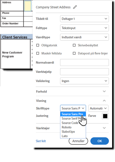 I Adobe Acrobat Signs oprettelsesmiljø kan du vælge udseendet på den skrifttype, der vises i dine formularfelter. Justerbare elementer omfatter skrifttypens familie, størrelse, farve samt margener.