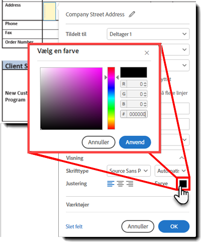 Brug Farve til at vælge feltets skriftfarve. Farven vises kun i PDF-kopien. Når feltet udfyldes, forbliver skriften sort.
