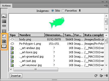 Para que aparezca en el panel Activos, un archivo debe pertenecer a una de estas categorías. Otros tipos de archivos a veces se denominan activos, pero no se muestran en este panel.