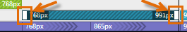 Se muestran los selectores de cambio de tamaño. En el caso de las consultas de medios que tienen valores tanto min-width como max-width, se muestran los selectores de cambio de tamaño a ambos lados de la barra.