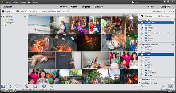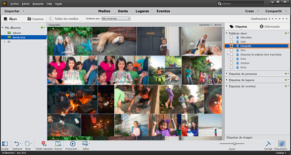 Las etiquetas de palabras clave permiten buscar fotografías y otros archivos con rapidez. Cuando utiliza etiquetas de palabras clave para buscar fotografías y archivos de medios, la barra Búsqueda avanzada muestra las etiquetas de palabras clave que ha seleccionado. Las búsquedas comienzan nada más seleccionar las etiquetas en el panel Etiquetas de palabras clave.