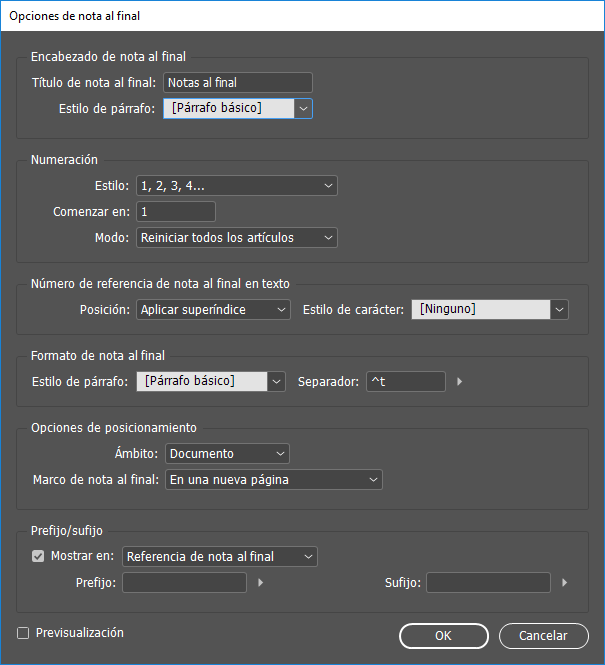 - Si borra las modificaciones y los estilos de carácter en un párrafo que incluye un marcador de referencia de nota al final, los números de referencia de las notas al pie de página pierden los atributos aplicados en el cuadro de diálogo Opciones de notas al final del documento.