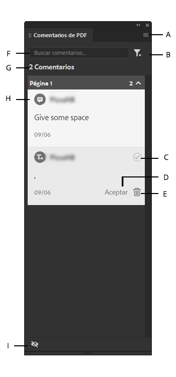 A. Menú del panel Comentarios de PDF B. Filtrar comentarios C. Marcar como resuelto/sin resolver D. Aceptar un comentario E. Eliminar un comentario F. Buscar comentarios G. Número de comentarios H. Tipo de comentario I. Mostrar/ocultar comentarios en el diseño