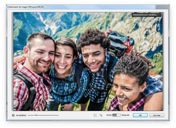 3. Cuando se abra el cuadro de diálogo Estabilizador de imagen, Photoshop Elements colocará una región de estabilización sobre la imagen y empezará a analizarla. Cuando el análisis haya finalizado, empezará a corregir el desenfoque de toda la foto.