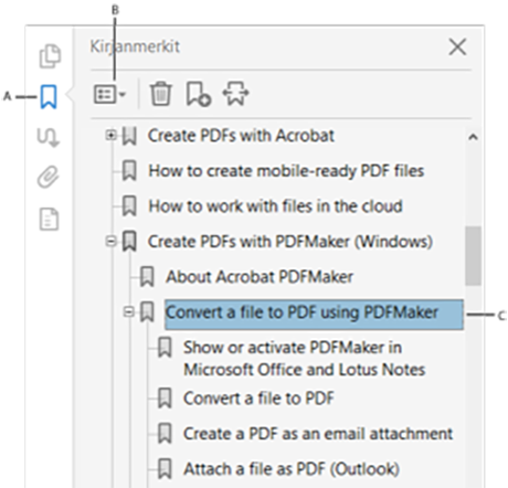 Jos haluat siirtyä tiettyyn aiheeseen, napsauta sen kirjanmerkkiä. Laajenna tai supista kirjanmerkkien sisältöä tarpeen mukaan.Huomautus: