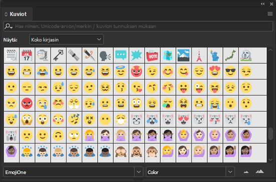 Kuviot-paneeli, jossa näkyy EmojiOne-SVG-kirjasinmerkkejä