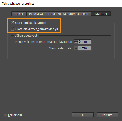 Ulota alaviitteet tekstikehyksen sarakkeiden yli