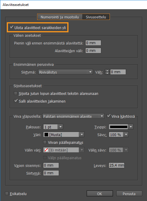 3. Valitse Ota ohitukset käyttöön ja Ulota alaviitteet sarakkeiden yli.