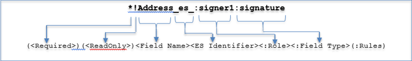 {{#shortened_name=Standard Tag Syntax}}. Esimerkiksi {{#r=[]ReceiveCommunication_es_:signer1}} sisältää täydellisen tagimäärityksen viitetagille nimeltä "r". Tässä esimerkissä tagi määrittelee valintaruudun, joka on suunnattu vastaanottajalle "signer1".