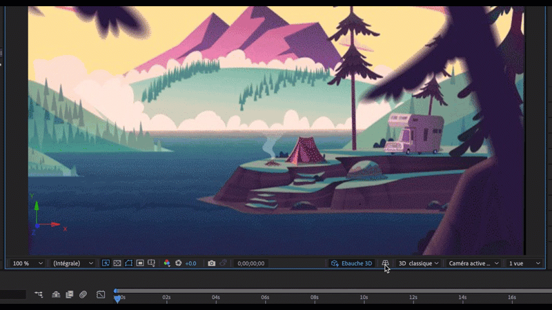 Obtenez un rendu en temps réel des modifications apportées à vos conceptions 3D dans After Effects. À l’aide d’un moteur 3D avancé plus rapide et plus efficace, vous pouvez obtenir des aperçus cohérents en temps réel tout au long du processus de création. Dans la conceptioon des mouvements, la vitesse d’itération et d’expérimentation est essentielle dans la prise des décisions au niveau créatif. Utilisez la prévisualisation d’Ébauche 3D pour réduire le temps de latence au niveau de la prévisualisation, et accélérez ainsi le processus menant de l’idée à l’action et, enfin, au résultat. Vous pouvez l’activer à l’aide du bouton Ébauche 3D dans la barre d’outils de composition.