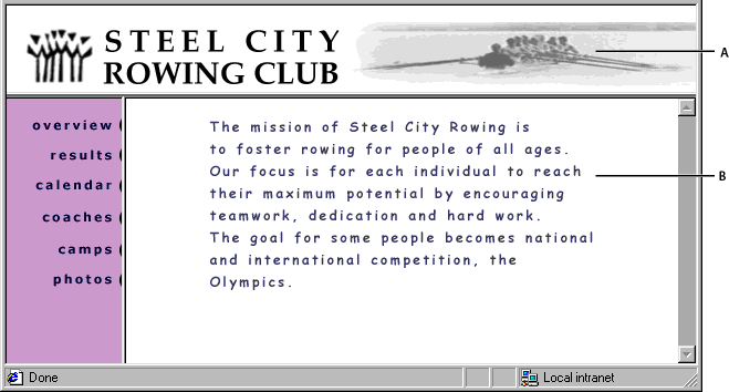 Dans cet exemple, le document affiché dans le cadre supérieur ne change jamais lorsque les visiteurs consultent le site. La barre de navigation du cadre latéral contient des liens qui, lorsqu’ils sont activés, modifient le contenu du cadre principal, mais pas le contenu du cadre latéral. Le cadre de contenu principal à droite affiche le document correspondant à tous les liens activés par le visiteur dans la partie gauche.