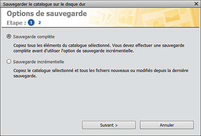 Cette option permet d’effectuer une copie du catalogue et de tous les fichiers de support, les fichiers PDF, les projets et autres fichiers associés, nouveaux ou modifiés, depuis la dernière sauvegarde complète ou incrémentale.