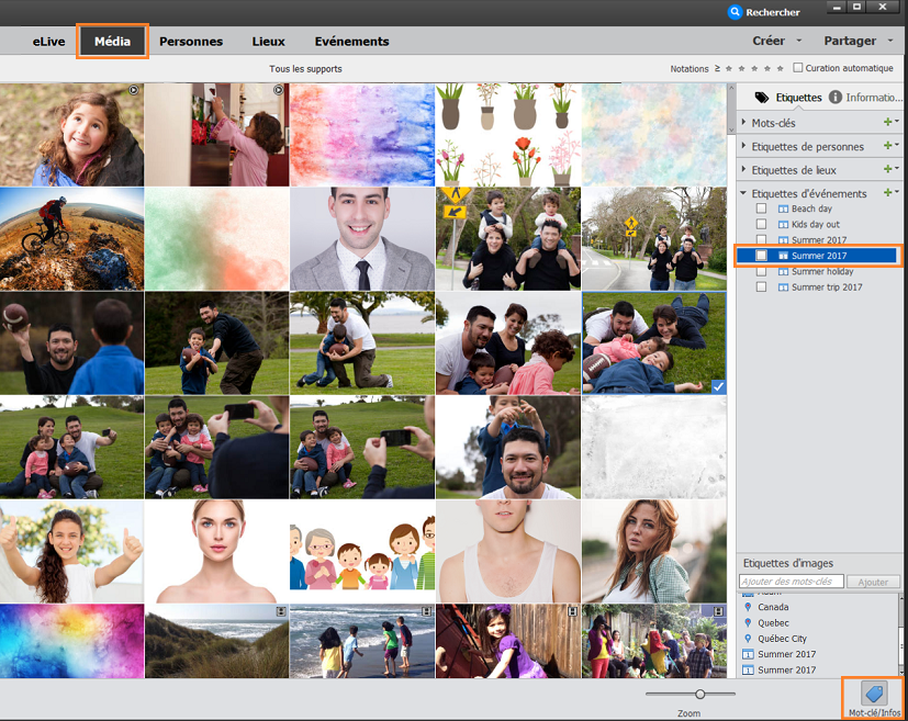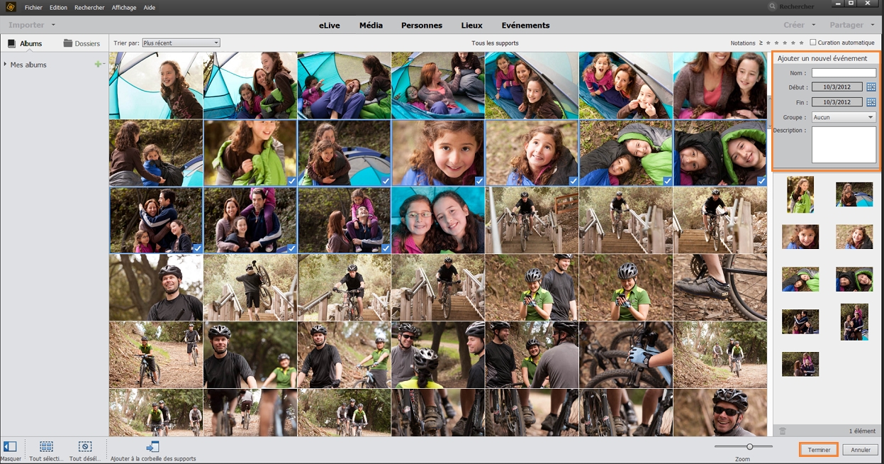 Vous pouvez avoir envie de regrouper vos photos ou vos fichiers vidéo selon l’événement auquel ils sont associés, par exemple un mariage ou un anniversaire. Elements Organizer propose deux manières d’organiser vos fichiers de support par événement :