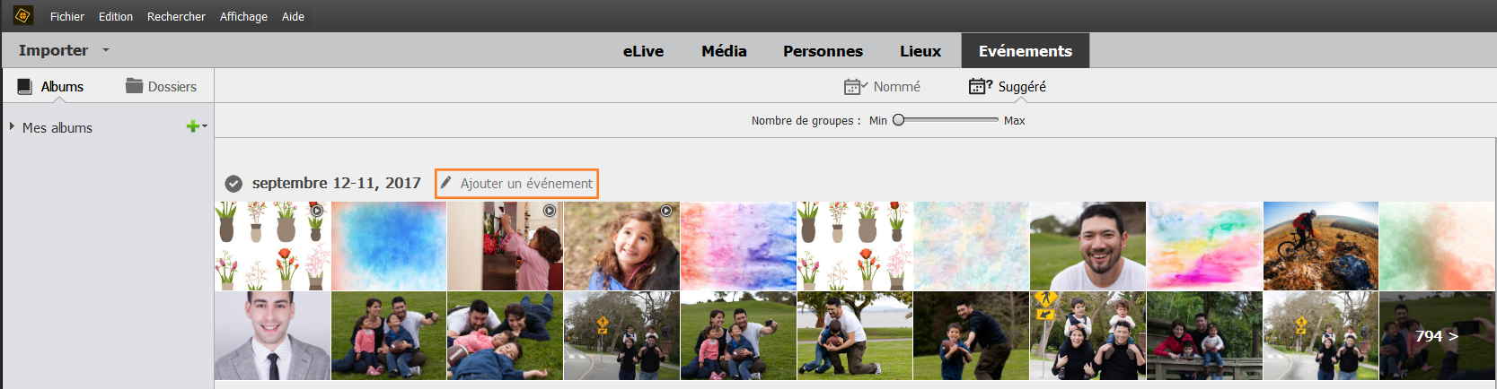 Dans la vue Evénements, cliquez sur l’onglet Nommé. L’onglet Nommé affiche vos fichiers organisés par événements. Elements Organizer crée une pile d’événements avec les photos que vous avez sélectionnées dans la section précédente.