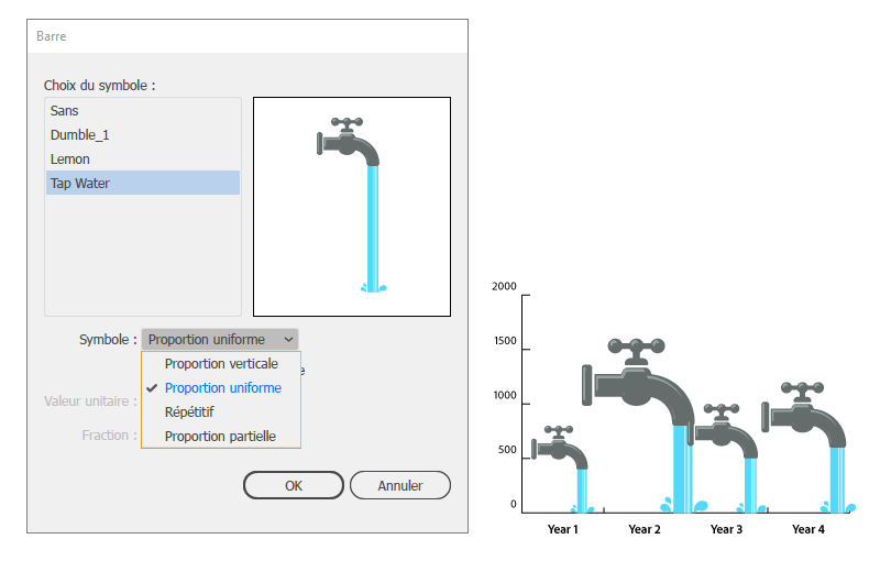 Permet de répéter un symbole pour remplir les colonnes du graphe. Vous pouvez lui donner une valeur, puis le tronquer ou le réduire proportionnellement lorsqu’il représente une fraction de cette valeur.