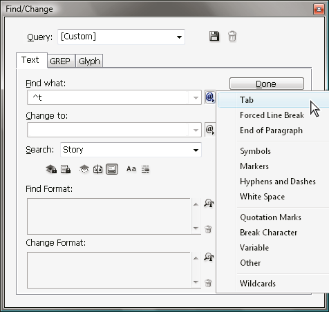 Sélectionnez Texte, GREP ou un autre onglet pour effectuer la recherche que vous voulez.