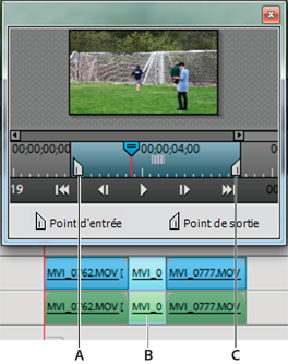 Le découpage d’un élément dans la fenêtre Prévisualisation définit les points d’entrée et de sortie pour toutes les occurrences suivantes de l’élément dans le montage en mode Rapide ou en mode Expert. Toutefois, ceci ne modifie pas les points d’entrée et de sortie des occurrences d’élément déjà insérées dans le montage en mode Expert ou dans le montage en mode Rapide. Afin que toutes les occurrences d’un élément soient calées sur les mêmes points d’entrée et de sortie, définissez ces derniers avant de placer l’élément dans le montage en mode Rapide ou Expert.
