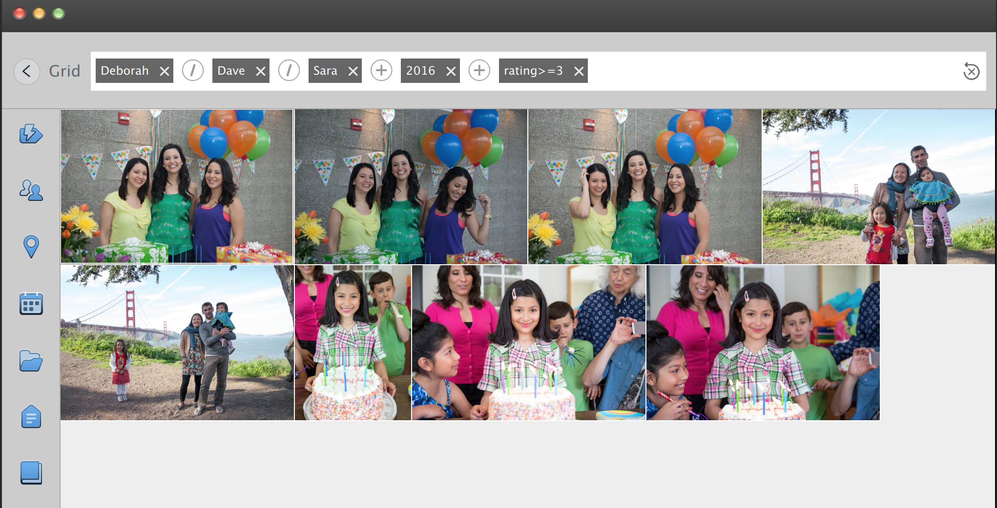 When, in addition to these people, you expand the search to include the images that have a star rating of 3 or higher, the search results are updated to show only those media files that include one or more of these people and that have the star rating of 3 or higher. For example, if any media file includes Deborah, but has a star rating of 2, that file is not displayed.