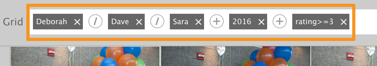 • All John’s good images (rating equal to or greater than 4), tagged as Family (keyword), and dated March 2016 (date)