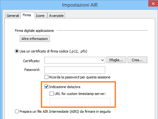 Nella scheda Firma, selezionate Prepara un file AIR Intermediate (AIRI) da firmare in seguito, quindi fate clic su OK.