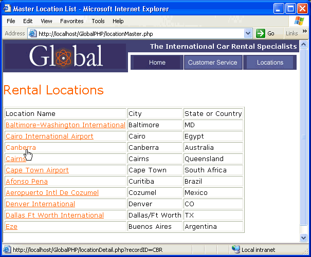 Quando la pagina viene eseguita, i valori del campo CODE del recordset vengono inseriti nelle righe corrispondenti della tabella dinamica. Ad esempio, se la sede dell'autonoleggio di Canberra (Australia) ha il codice CBR, l'URL seguente viene utilizzato nella riga Canberra della tabella dinamica: