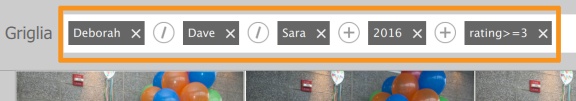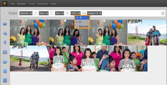 Quando si espande la ricerca aggiungendo, oltre a queste persone, le immagini con una valutazione superiore o uguale a 3 stelle, i risultati della ricerca vengono aggiornati in modo da visualizzare solo i file multimediali che includono una o più di queste persone e che hanno una valutazione superiore o uguale a 3 stelle. Per esempio, se un file multimediale contiene Deborah, ma ha una valutazione di 2 stelle, il file non viene visualizzato.