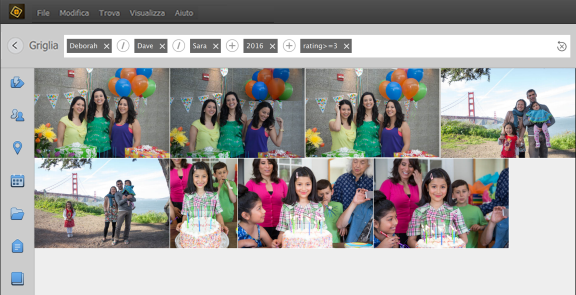 Quando si esegue una ricerca di più entità all’interno di una categoria, il risultato della ricerca mostra tutti i file multimediali che contengono una o più entità tra quelle specificate. A titolo illustrativo, nell’esempio precedente avete cercato nel pannello Persone immagini che includevano Deborah, Dave o Sarah. In questo caso, venivano visualizzate tutte le immagini in cui erano presenti una (o più) di queste persone.