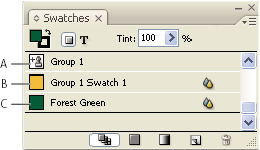 Utilizzate il pannello Campioni per eliminare i gruppi di inchiostri misti, aggiungere campioni e convertire i campioni di inchiostri misti in colori quadricromia.