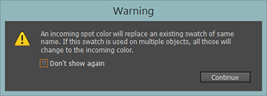 Ora, se importate dei file con un canale tinta piatta di colore con lo stesso nome di un colore tinta piatta già presente nel documento, verrà visualizzato il seguente avvertimento: