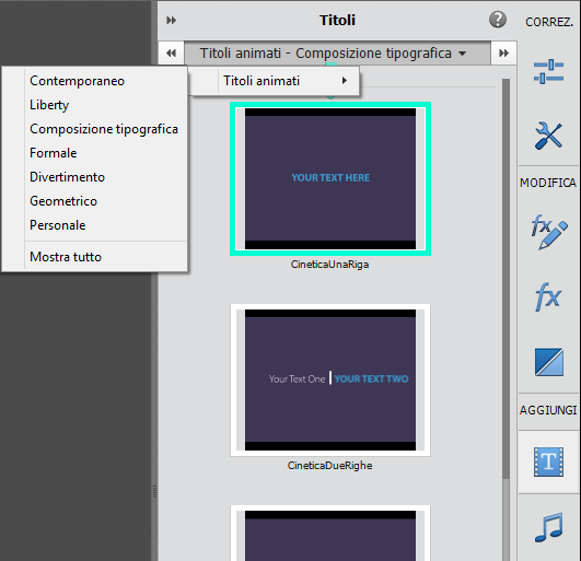 La finestra di dialogo Titoli mostra vari modelli tra cui scegliere. Seleziona Titoli animati - Composizione tipografica > Titoli animati per visualizzare altre opzioni. Seleziona Mostra tutto nel menu a discesa per visualizzare tutti i modelli disponibili tra tutte le opzioni per i titoli animati.