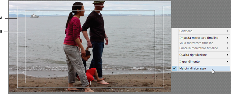 I margini di sicurezza risultano utili durante il montaggio destinato alla trasmissione broadcast o alla videoregistrazione. La maggior parte degli apparecchi televisivi usa un processo denominato overscan, che taglia una parte dei bordi esterni e ingrandisce il centro dell’immagine. La quantità di overscan non è uguale per tutti i televisori; per essere certi che i titoli e le azioni importanti rientrino nell’area di visualizzazione della maggior parte dei televisori, mantenete il testo all’interno dei margini di sicurezza titoli e tutti gli altri elementi importanti all’interno dei margini di sicurezza azioni.