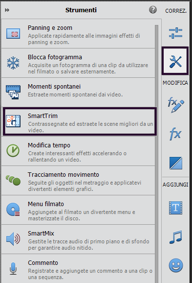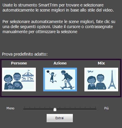 SmartTrim analizza automaticamente la clip e seleziona le migliori scene sulla base di uno delle tre seguenti impostazioni predefinite per i video.