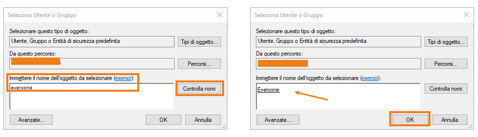 c. Digita Everyone o immetti l’ID utente amministratore (Enterprise Environment) e fai clic su Controlla nomi per assicurarti che la voce dell’utente sia corretta.