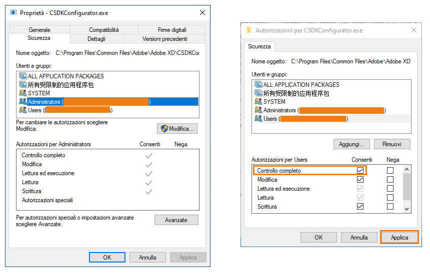 e. Fai clic sulla scheda Protezione, quindi su Modifica per impostare le autorizzazioni per l’utente corrente.