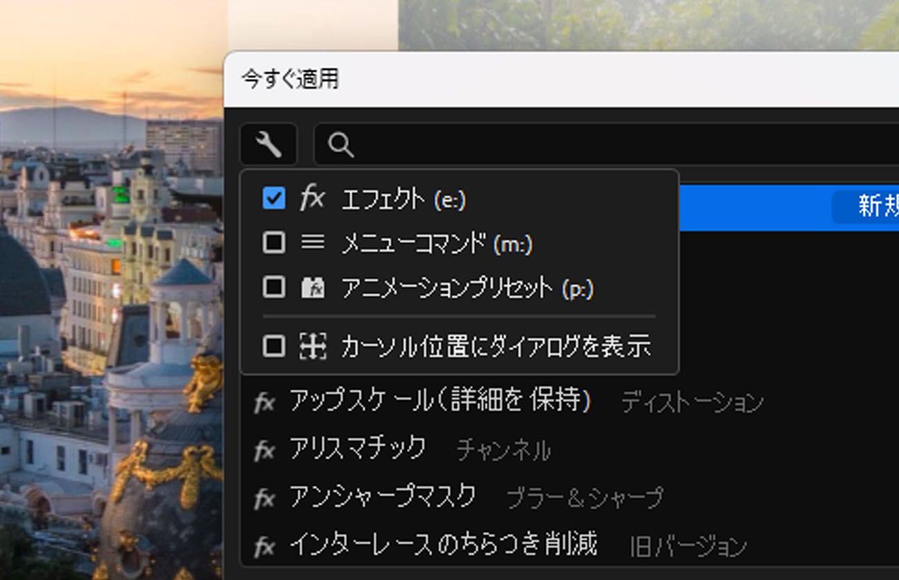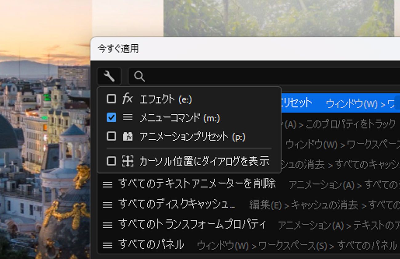 m: に続けてコマンド名を入力してメニューコマンドを検索します。 m: に続けてコマンド名を入力してメニューコマンドを検索します。 エフェクトやプリセットを適用したり、メニューコマンドを実行したりする場合、選択したレイヤーに適用したり、新しいレイヤーを作成したり、調整レイヤーとして追加したりできます。