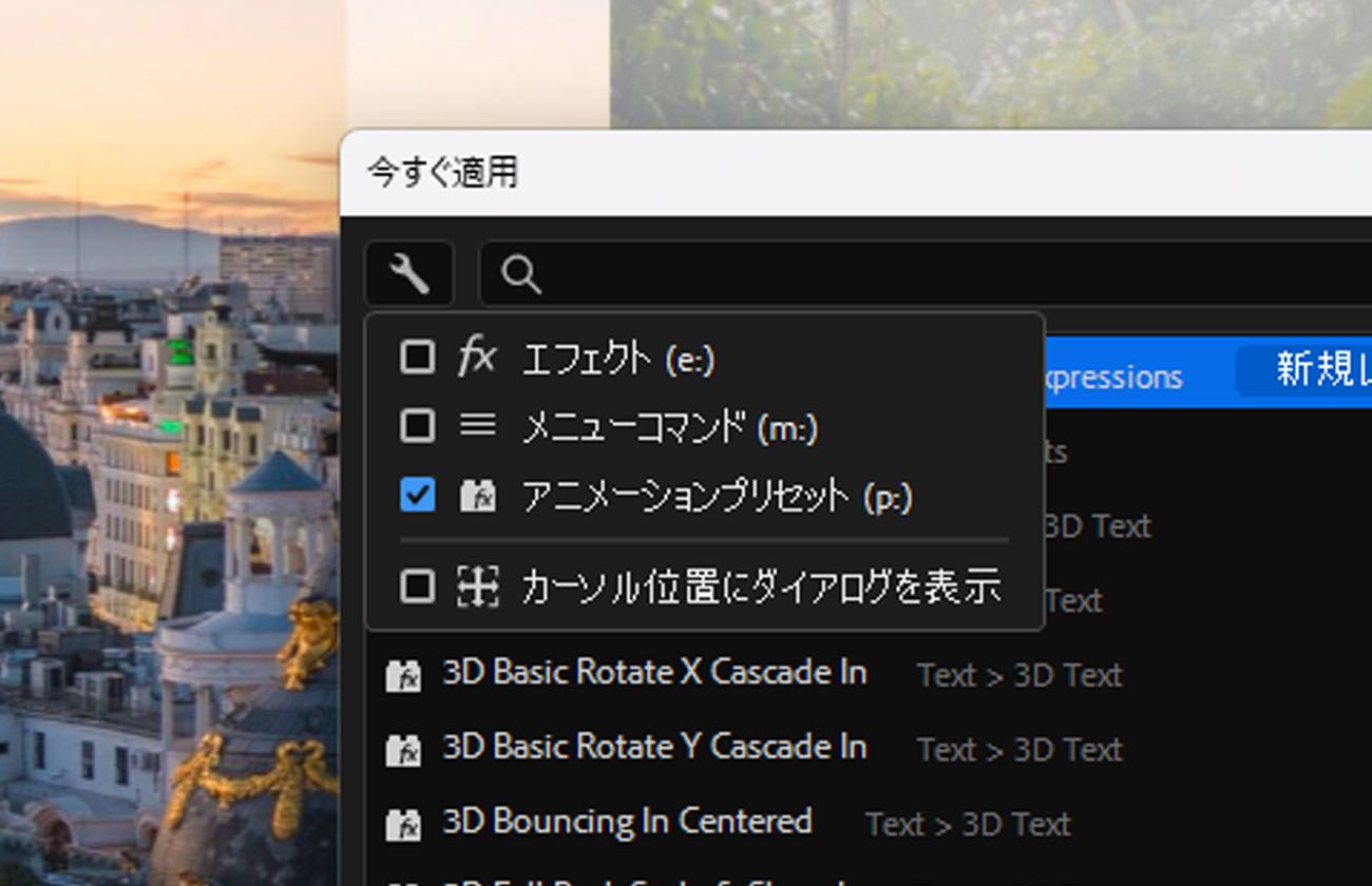 テキストプリセットやその他のアニメーションプリセットを検索して、選択したレイヤーに適用するか、新しいレイヤーまたは調整レイヤーに追加します。