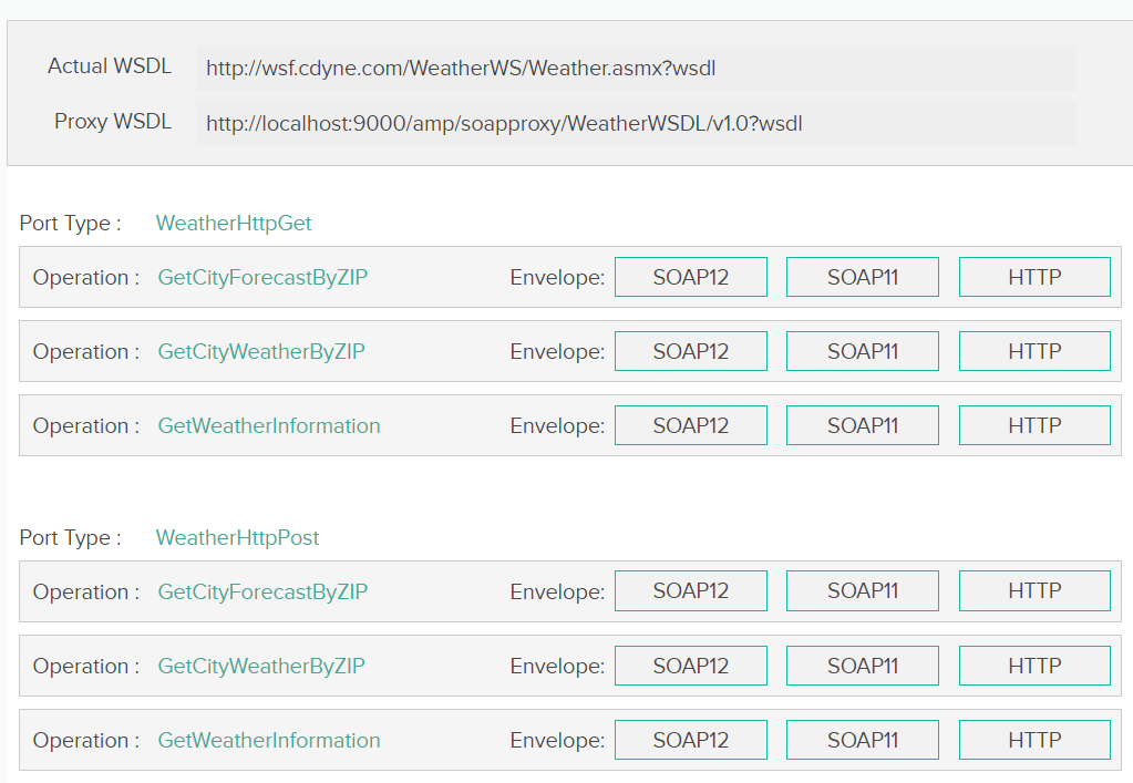 2つの WSDL を比較する場合は、実際のエンドポイント(http://wsf.cdyne.com/WeatherWS/Weather.asmx)が API Manager によって生成されたプロキシ( http ://localhost:9100/WeatherWSDL/v1.0/{Binding})に置き換えられます。