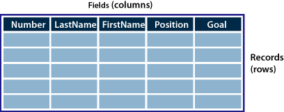 テーブルに格納されたデータの集合体。テーブルの各行は単一のレコードを、各列は次の例のようにレコード内の単一のフィールドを構成します。
