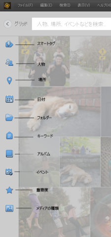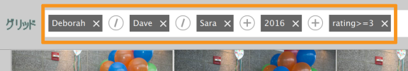 検索機能が強化されて、特別な瞬間を手早く簡単に見つけられるようになりました。1 つの画面でメディアに複数のパラメーターでフィルターをかけることができます。また、検索に使用するユーザーストーリーを組み立てることもできます。例えば、以下のような検索の結果が簡単に得られます。