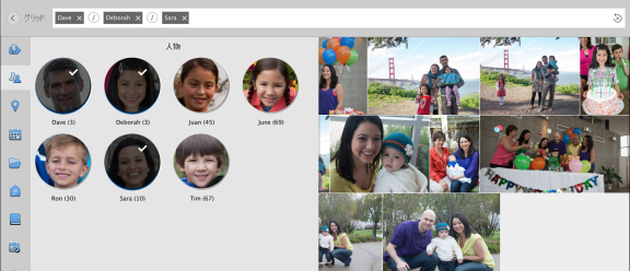 これらの人物のほかに検索対象を広げ、重要度が 3 以上の画像という条件も含めると、検索結果が更新され、指定した人物が 1 人以上写っており、かつ、重要度が 3 以上というメディアファイルだけが表示されます。例えば、デボラが写っていても、重要度が 2 であれば、そのメディアファイルは表示されません。