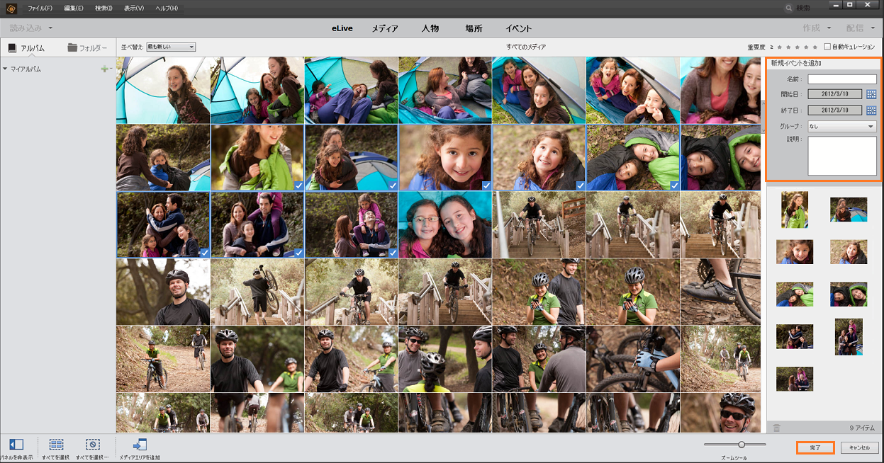 写真やビデオなどのメディアファイルにイベント情報を追加しましょう。イベント別に整理されて、簡単に表示できるようになり、イベントの思い出が生き生きとよみがえります。